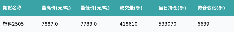 南方财经1月20日电,南财金融终端盘后期货数据显示,大连商品交易所的塑料主力合约收跌0.27%,收盘报7831.0元/吨,日内资金流入1870.49万元。其他相关指标见下表: